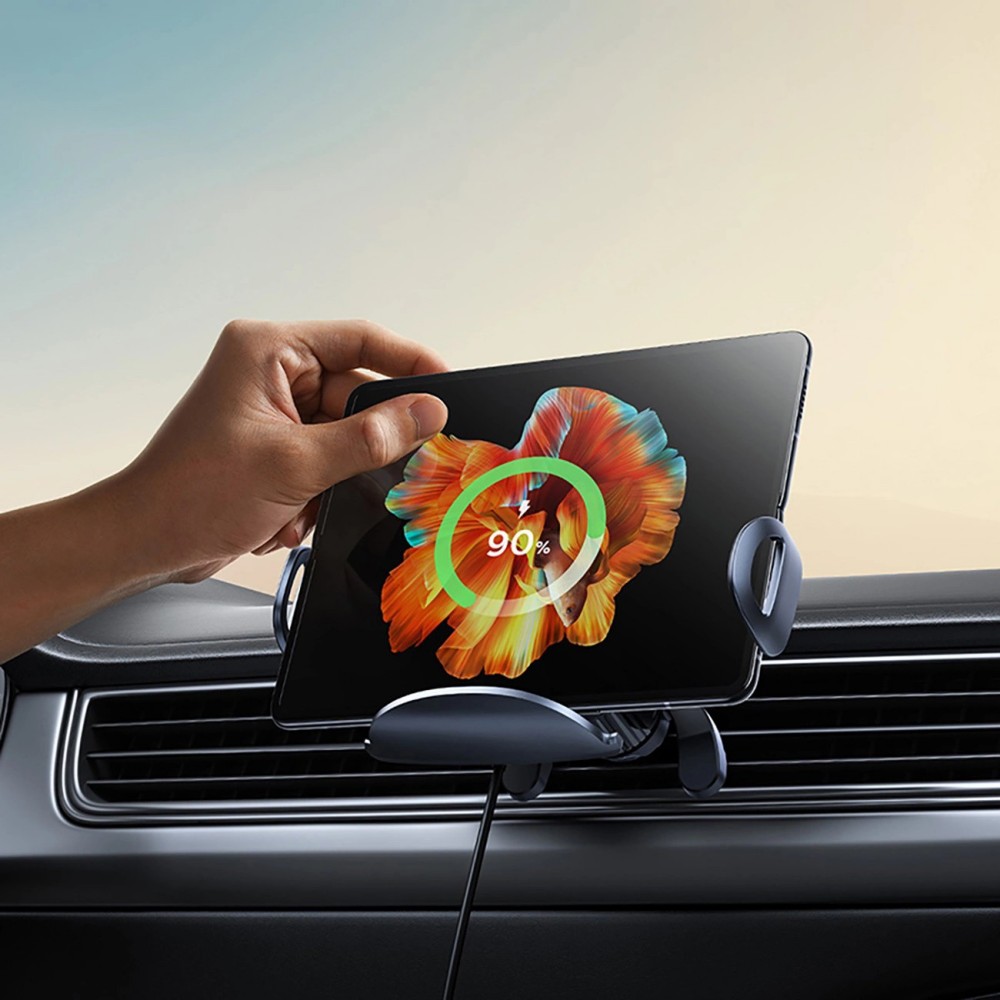 Автомобільний тримач Baseus LightChaser поєднує універсальне кріплення на вентиляційний отвір із потрійною індукційною котушкою для бездротової зарядки потужністю до 15 Вт, підтримуючи більшість смартфонів у вертикальному та горизонтальному положенні з надійною фіксацією та захистом від перенапруги та перегріву.