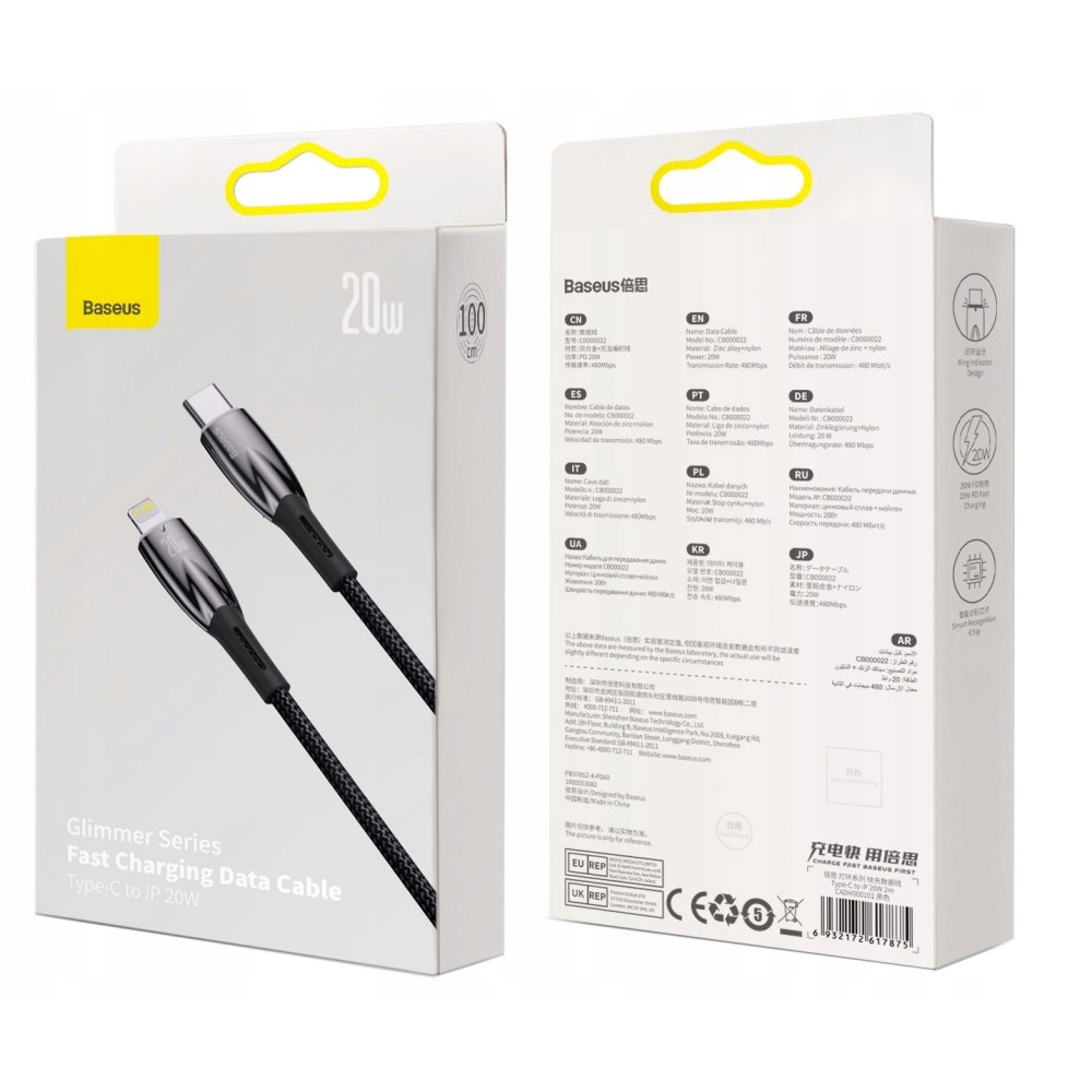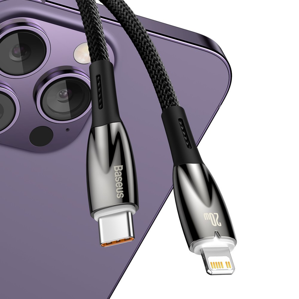 Високоякісний кабель Baseus Glimmer з підсвіченням Halo забезпечує швидку зарядку до 20 Вт, передачу даних 480 Мбіт/с та надійний захист завдяки міцній конструкції з цинкового сплаву й нейлонового обплетення.